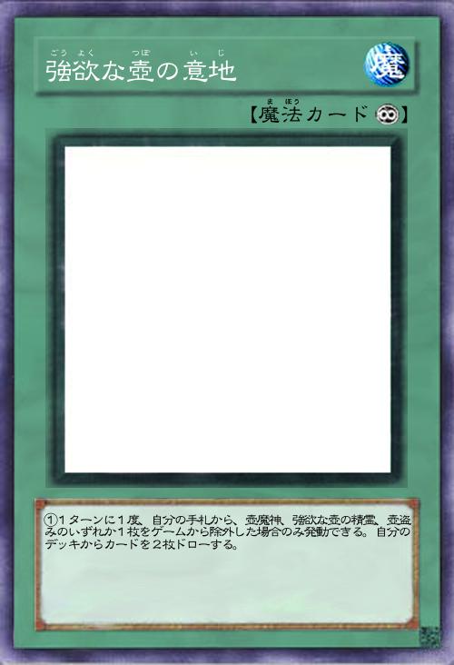 | ①1ターンに1度、自分の手札から、壺魔神、強欲な壺の精霊、壺盗みのいずれか1枚をゲームから除外した場合のみ発動できる。自分のデッキからカードを2枚ドローする。 | |||