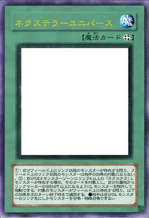 | ①:自分フィールド上にリンク状態のモンスターが存在する限り、フィールド上のリンク状態のモンスターは相手の効果の対象にならない。②:自分のEXモンスターゾーンにリンク4以上の「ネクステラ」Lモンスターが存在する場合、そのカードを対象とし、自分の墓地からリンクマーカーの合計が7以上になるようにLモンスターを除外して発動できる。対象のモンスターがフィールド上に存在する限り、以下の効果を次のターン終了時まで適用する。●相手は自分のLモンスターのリンク先にしかモンスターを召喚・特殊召喚できない | |||