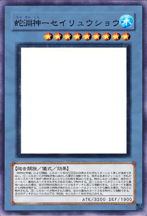 | 「蛇神の祭壇」により降臨。このカード名の①②③の効果はそれぞれ1ターンに1度しか使用できない。①:このカードが特殊召喚に成功した場合に発動できる。相手は自身のフィールド・手札からモンスターを1体ずつ除外することでこの効果を無効にできる。除外しなかった場合、相手のフィールド・墓地のカードをそれぞれ2枚まで選んで除外する。②:このカードがフィールドから墓地へ送られた場合、自分の除外状態のカード4枚をデッキに戻して発動できる。このカードを墓地から特殊召喚する。この効果で特殊召喚されたこのカードはフィールドから離れる場合、代わりに除外される。③:このカードが除外された場合、自分の墓地のカード2枚を除外して発動できる。自分のデッキからレベル8以下の「蛇淵」モンスター1体を手札に加える。 | |||