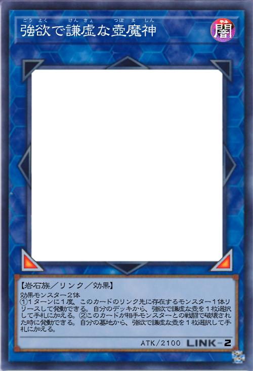 | 効果モンスター2体 ①1ターンに1度、このカードのリンク先に存在するモンスター1体リリースして発動できる。自分のデッキから、強欲で謙虚な壺を1枚選択して手札に加える。②このカードが相手モンスターとの戦闘で破壊された時に発動できる。自分の墓地から、強欲で謙虚な壺を1枚選択して手札に加える。 | |||