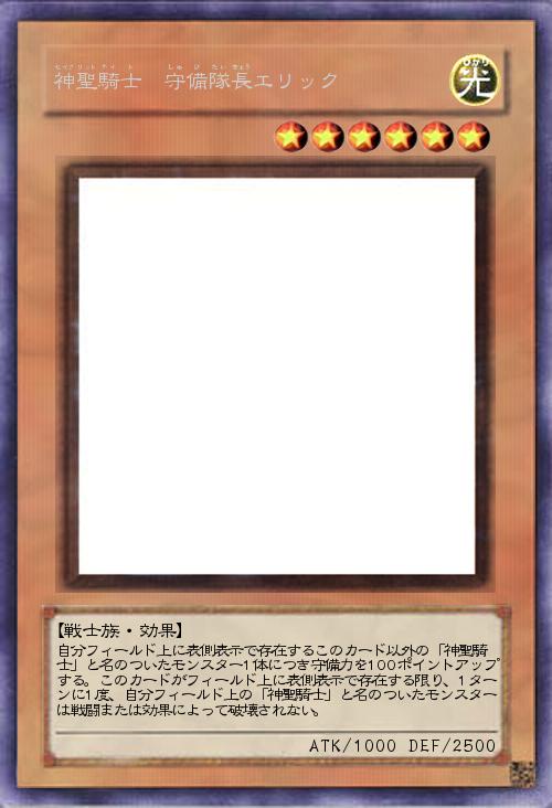 | 自分フィールド上に表側表示で存在するこのカード以外の「神聖騎士」と名のついたモンスター1体につき守備力を100ポイントアップする。このカードがフィールド上に表側表示で存在する限り、1ターンに1度、自分フィールド上の「神聖騎士」と名のついたモンスターは戦闘または効果によって破壊されない。 | |||