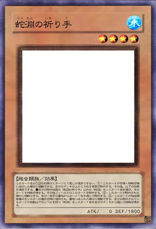 | このカード名の①③の効果は1ターンに1度しか使用できない。①:このカードが召喚・特殊召喚に成功した場合に発動できる。自分のデッキの上から3枚を表側で除外する。その後、以下の効果を適用できる。●自分の除外状態の「蛇淵の祈り手」以外の「蛇淵」モンスター1体を選び、そのカードを特殊召喚する。その後フィールドのこのカードを除外する。②:このカードが除外された場合に発動できる。自分・相手の墓地からカード1枚を選んで除外する。③:このカードが爬虫類族儀式モンスターの儀式召喚に使用され、墓地へ送られた場合に発動できる。自分の除外されているカードの枚数以下のレベルを持つ「蛇淵」モンスター1体を自分のデッキから選んで特殊召喚する。 | |||