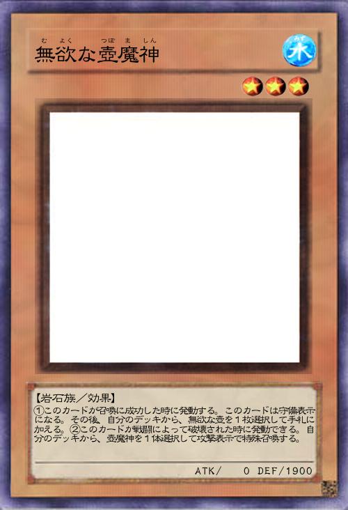 | ①このカードが召喚に成功した時に発動する。このカードは守備表示になる。その後、自分のデッキから、無欲な壺を1枚選択して手札に加える。②このカードが戦闘によって破壊された時に発動できる。自分のデッキから、壺魔神を1体選択して攻撃表示で特殊召喚する。 | |||