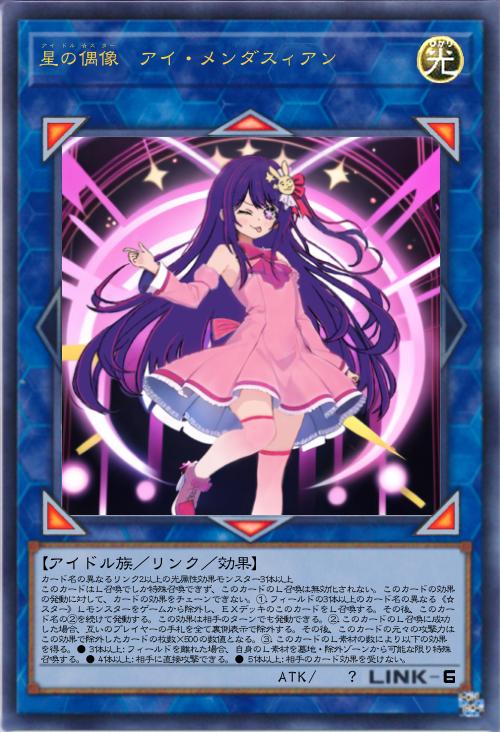 「《星の偶像 アイ》のリンク形態。素材さえ揃えばいつでも逆襲を仕掛けれる完璧でかつ無敵な存在。リンクマーカーの位置は目の中の星を元とし、カード名の最後の単語「メンダスィアン」はラテン語で「嘘」という意味です。」(2024-03-07 14:24)