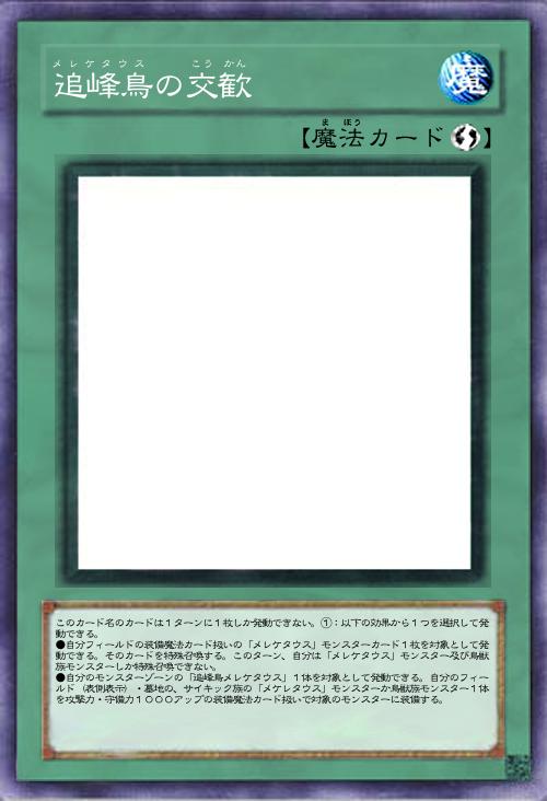 | このカード名のカードは1ターンに1枚しか発動できない。①:以下の効果から1つを選択して発動できる。 ●自分フィールドの装備魔法カード扱いの「メレケタウス」モンスターカード1枚を対象として発動できる。そのカードを特殊召喚する。このターン、自分は「メレケタウス」モンスター及び鳥獣族モンスターしか特殊召喚できない。 ●自分のモンスターゾーンの「追峰鳥メレケタウス」1体を対象として発動できる。自分のフィールド(表側表示)・墓地の、サイキック族の「メケレタウス」モンスターか鳥獣族モンスター1体を攻撃力・守備力1000アップの装備魔法カード扱いで対象のモンスターに装備する。 | |||