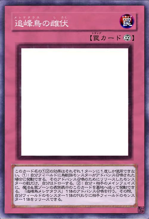 | このカード名の①②の効果はそれぞれ1ターンに1度しか使用できない。①:自分フィールドに鳥獣族モンスターがアドバンス召喚された場合に発動できる。そのアドバンス召喚のためにリリースしたモンスターの数だけ、自分はドローする。②:自分・相手のメインフェイズに、魔法&罠ゾーンの表側表示のこのカードを墓地へ送って発動できる。「追峰鳥メレケタウス」1体のアドバンス召喚を行う。その際、自分フィールドのモンスター1体の代わりに相手フィールドのモンスター1体をリリースできる。 | |||