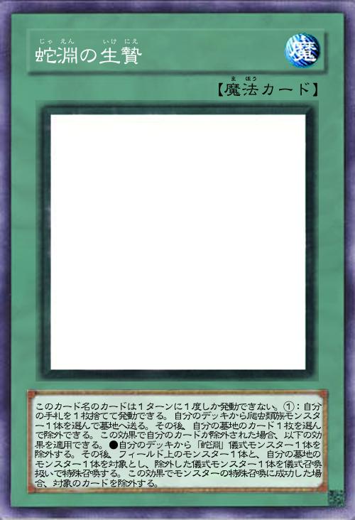 | このカード名のカードは1ターンに1度しか発動できない。①:自分の手札を1枚捨てて発動できる。自分のデッキから爬虫類族モンスター1体を選んで墓地へ送る。その後、自分の墓地のカード1枚を選んで除外できる。この効果で自分のカードが除外された場合、以下の効果を適用できる。●自分のデッキから「蛇淵」儀式モンスター1体を除外する。その後、フィールド上のモンスター1体と、自分の墓地のモンスター1体を対象とし、除外した儀式モンスター1体を儀式召喚扱いで特殊召喚する。この効果でモンスターの特殊召喚に成功した場合、対象のカードを除外する。 | |||