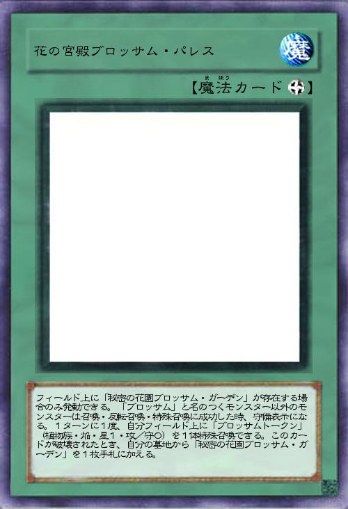 「張替え前提のフィールド魔法って珍しいのではないかと思って作ってみました。ガーデンが下級ブロッサムサポートカードだったので、こちらは上級ブロッサムのサポートの性質が強いです。前半のつまずきを相手にのみ押し付けるのはうざったらしいことこのうえないのでやりすぎたかも・・・(´-`)」(2012-08-05 17:41)