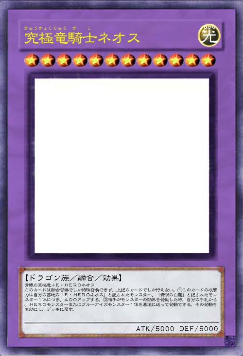 | 青眼の究極竜+E・HEROネオス このカードは融合召喚でしか特殊召喚できず、上記のカードでしか行えない。①このカードの攻撃力は自分の墓地の「E・HEROネオス」と記されたモンスター、「青眼の白龍」と記されたモンスター1体につき、400アップする。②相手がモンスターの効果を発動した時、自分の手札から、HEROモンスターまたはブルーアイズモンスター1体を墓地に送って発動できる。その発動を無効にし、デッキに戻す。 | |||