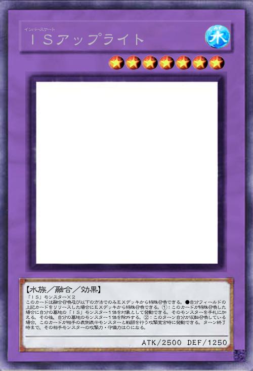 | 「IS」モンスター×2 このカードは融合召喚及び以下の方法でのみEXデッキから特殊召喚できる。●自分フィールドの上記カードをリリースした場合にEXデッキから特殊召喚できる。①:このカードが特殊召喚した場合に自分の墓地の「IS」モンスター1体を対象として発動できる。そのモンスターを手札に加える。その後、自分の墓地のモンスター1体を除外する。②:このターン自分が反転召喚している場合、このカードが相手の表側表示モンスターと戦闘を行う攻撃宣言時に発動できる。ターン終了時まで、その相手モンスターの攻撃力・守備力は0になる。 | |||