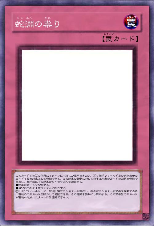 | このカード名の②の効果は1ターンに1度しか使用できない。①:相手フィールド上の表側表示のカード1枚を対象として発動できる。この効果の発動に対して相手は対象のカードの効果を発動できない。相手は以下の効果から1つを選んで適用する。 ●対象のカードを除外する。 ●自分の手札を1枚ランダムに除外する。 ②:自分フィールド上に「蛇淵」儀式モンスターが存在し、相手がモンスターの効果を発動する時、墓地のこのカードを除外して発動できる。その発動を無効にし除外する。この効果はこのカードが墓地へ送られたターンには発動できない。 | |||