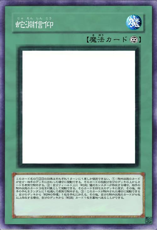 | このカード名の①②③の効果はそれぞれ1ターンに1度しか使用できない。①:除外状態のカードが自分・相手のデッキに加わった場合に発動できる。そのカードの枚数分自分のデッキの上からカードを表側で除外する。②:自分フィールド上に「蛇淵」儀式モンスターが存在する場合、相手の除外状態のカード3枚を対象として発動できる。そのカードを持ち主のデッキに戻す。その後、相手の手札をランダムに1枚選んで表側で除外する。③:このカードが除外された場合に発動できる。自分のデッキから「蛇神の祭壇」1枚を手札に加える。その後、自分の除外状態のカードが4枚以上存在する場合、自分のデッキから「蛇淵」カード1枚を墓地へ送ることができる。 | |||