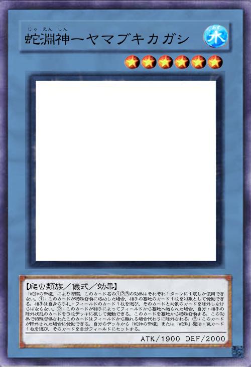 | 「蛇神の祭壇」により降臨。このカード名の①②③の効果はそれぞれ1ターンに1度しか使用できない。①:このカードが特殊召喚に成功した場合、相手の墓地のカード1枚を対象として発動できる。相手は自身の手札・フィールドのカード1枚を選び、そのカードと対象のカードを除外しなけらばならない。②:このカードが相手によってフィールドから墓地へ送られた場合、自分・相手の除外状態のカードを3枚デッキに戻して発動できる。このカードを墓地から特殊召喚する。この効果で特殊召喚されたこのカードはフィールドから離れる場合代わりに除外される。③:このカードが除外された場合に発動できる。自分のデッキから「蛇神の祭壇」または「蛇淵」魔法・罠カード1枚を選び、そのカードを自分フィールドにセットする。 | |||