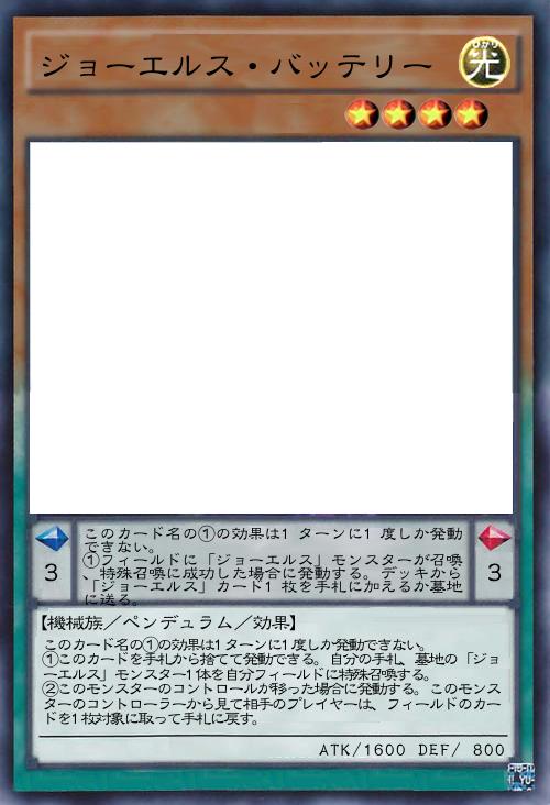 | このカード名の①の効果は1ターンに1度しか発動できない。 ①フィールドに「ジョーエルス」モンスターが召喚、特殊召喚に成功した場合に発動する。デッキから「ジョーエルス」カード1枚を手札に加えるか墓地に送る。 | |||