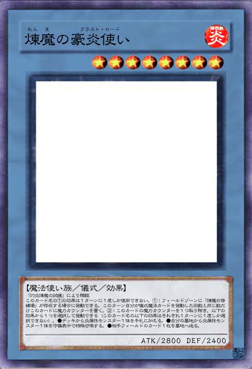 | 「灼炎煉魔の試練」により降臨 このカード名の①の効果は1ターンに1度しか使用できない。①:フィールドゾーンに「煉魔の修練場」が存在する場合に発動できる。このターン自分が儀式魔法カードを発動した回数と同じ数だけこのカードに魔力カウンターを置く。②:このカードの魔力カウンターを1つ取り除き、以下の効果から1つを選択して発動できる(このカード名の以下の効果はそれぞれ1ターンに1度しか選択できない)。●デッキから炎属性モンスター1体を手札に加える。●自分の墓地から炎属性モンスター1体を守備表示で特殊召喚する。●相手フィールドのカード1枚を墓地へ送る。 | |||