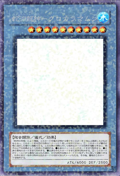 | 「蛇神の祭壇」により降臨。このカードを儀式召喚する場合モンスターを2体以上使用しなければならない。このカード名の①②の効果はそれぞれ1ターンに1度しか使用できない。①:このカードが儀式召喚に成功した場合に発動できる。この効果の発動に対して相手はカードの効果を発動できない。相手は以下の効果から1つを選んで適用する。●自身のフィールド上のカードを全て除外する。●自身の墓地のカードを全て除外する。●自身の手札のカードを全て表側で除外する。②:このカードがフィールドから墓地へ送られた場合、自分の除外状態のカードを5枚デッキに戻して発動できる。相手に自分・相手の除外状態のカードの合計×300ダメージ与える。その後、墓地のこのカードを除外する。 | |||