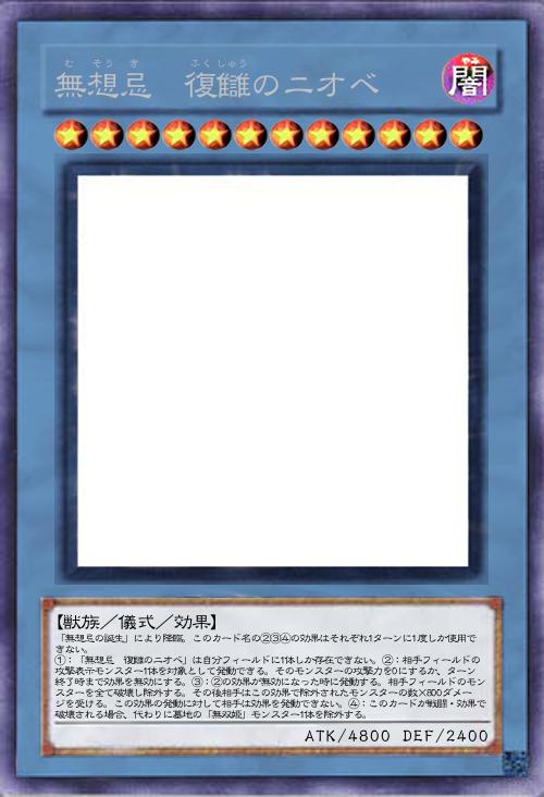 | 「無想忌の誕生」により降臨。このカード名の②③④の効果はそれぞれ1ターンに1度しか使用できない。 ①:「無想忌 復讎のニオべ」は自分フィールドに1体しか存在できない。②:相手フィールドの攻撃表示モンスター1体を対象として発動できる。そのモンスターの攻撃力を0にするか、ターン終了時まで効果を無効にする。③:②の効果が無効になった時に発動する。相手フィールドのモンスターを全て破壊し除外する。その後相手はこの効果で除外されたモンスターの数×800ダメージを受ける。この効果の発動に対して相手は効果を発動できない。④:このカードが戦闘・効果で破壊される場合、代わりに墓地の「無双姫」モンスター1体を除外する。 | |||