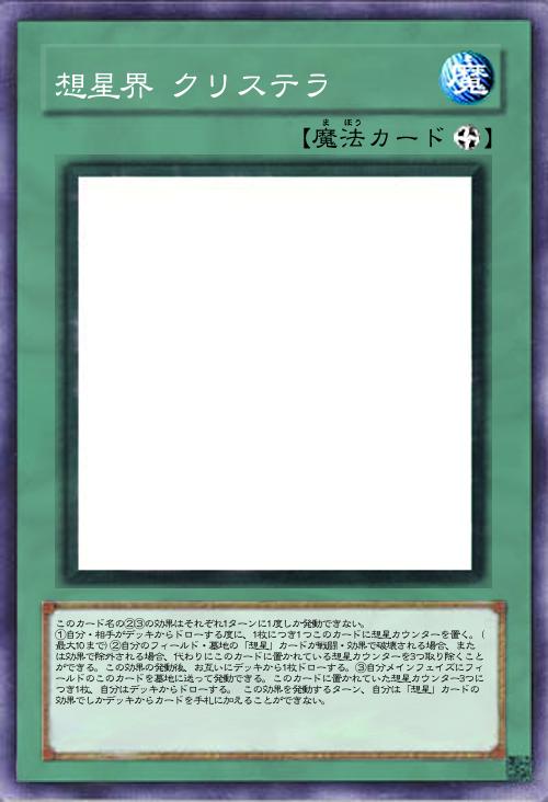 | このカード名の②③の効果はそれぞれ1ターンに1度しか発動できない。 ①自分・相手がデッキからドローする度に、1枚につき1つこのカードに想星カウンターを置く。(最大10まで)②自分のフィールド・墓地の「想星」カードが戦闘・効果で破壊される場合、または効果で除外される場合、代わりにこのカードに置かれている想星カウンターを3つ取り除くことができる。この効果の発動後、お互いにデッキから1枚ドローする。③自分メインフェイズにフィールドのこのカードを墓地に送って発動できる。このカードに置かれていた想星カウンター3つにつき1枚、自分はデッキからドローする。 この効果を発動するターン、自分は「想星」カードの効果でしかデッキからカードを手札に加えることができない。 | |||
