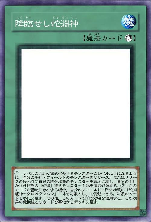 | ①:レベルの合計が儀式召喚するモンスターのレベル以上になるように、自分の手札・フィールドのモンスターをリリース、またはリリースの代わりに自分の除外状態のモンスターを墓地に戻し、自分の手札か除外状態の「蛇淵」儀式モンスター1体を儀式召喚する。②:このカードが墓地に存在する場合、自分のフィールド・除外状態の「蛇淵龍神ークロカラマムシ」1体を対象とし、て発動できる。対象のカードを手札に戻す。その後、このカードの①の効果を使用する。この効果の発動後このカードを墓地からデッキに戻す。 | |||