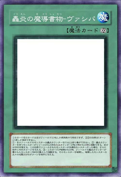 | このカード名のカードは自分フィールドに1枚しか表側表示で存在できず、②③の効果は1ターンに1度しか使用できない。 ①:自分フィールドのモンスターは轟炎カウンターを2つ以上持つ事ができない。②:轟炎カウンターを持つモンスターがリリースされた時またはカウンターが取り除かれた時に発動できる。自分は1000回復する。この効果でリリースされたモンスターが炎属性モンスターだった場合、さらに相手に1000ダメージを与える。③:このカードが破壊された時、フィールドの轟炎カウンターが置かれたモンスター1体を対象として発動する。そのモンスターを破壊し、破壊したモンスターの元々の攻撃力分のダメージを相手に与える。 | |||