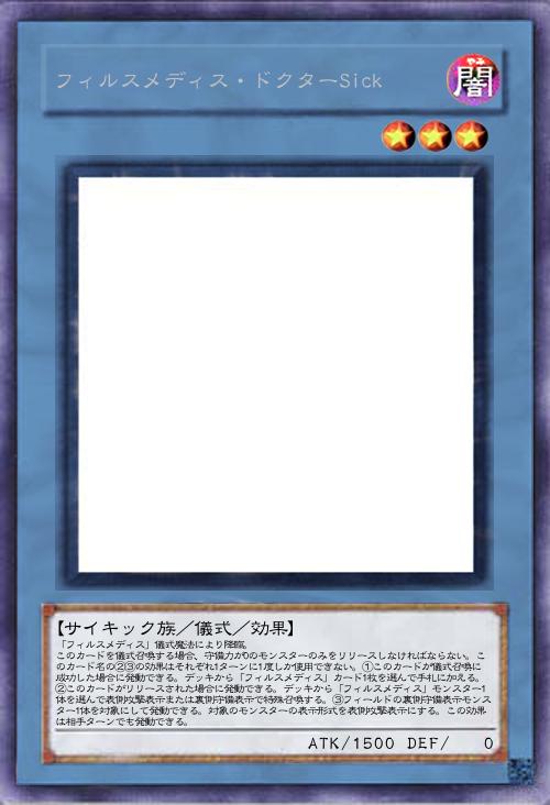 | 「フィルスメディス」儀式魔法により降臨。 このカードを儀式召喚する場合、守備力が0のモンスターのみをリリースしなければならない。このカード名の②③の効果はそれぞれ1ターンに1度しか使用できない。①このカードが儀式召喚に成功した場合に発動できる。デッキから「フィルスメディス」カード1枚を選んで手札に加える。②このカードがリリースされた場合に発動できる。デッキから「フィルスメディス」モンスター1体を選んで表側攻撃表示または裏側守備表示で特殊召喚する。③フィールドの裏側守備表示モンスター1体を対象にして発動できる。対象のモンスターの表示形式を表側攻撃表示にする。この効果は相手ターンでも発動できる。 | |||