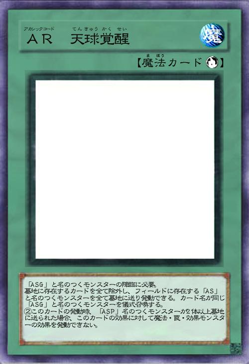| 「ASG」と名のつくモンスターの降臨に必要。 墓地に存在するカードを全て除外し、フィールドに存在する「AS」と名のつくモンスターを全て墓地に送り発動できる。カード名が同じ「ASG」と名のつくモンスターを儀式召喚する。 ②このカードの発動時、「ASP」名のつくモンスターが2体以上墓地に送られた場合、このカードの効果に対して魔法・罠・効果モンスターの効果を発動できない。 | |||