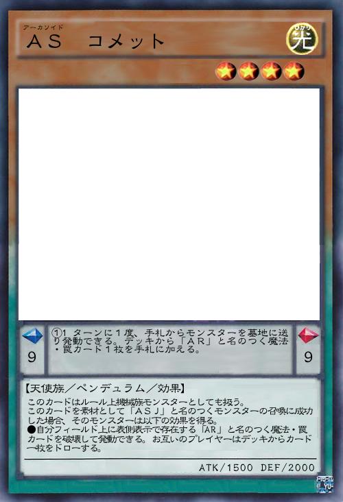 | このカードはルール上機械族モンスターとしても扱う。 このカードを素材として「ASJ」と名のつくモンスターの召喚に成功した場合、そのモンスターは以下の効果を得る。 ●自分フィールド上に表側表示で存在する「AR」と名のつく魔法・罠カードを破壊して発動できる。お互いのプレイヤーはデッキからカード一枚をドローする。 | |||