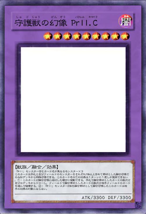 | 「Prll」モンスター含むカード名が異なるモンスター×3 このカードは手札と自分フィールドのモンスターをそれぞれ1体以上含めて素材とした融合召喚でのみEXデッキから特殊召喚できる。このカード名の①の効果は1ターンに1度しか使用できない。①:このカードが融合召喚に成功した場合に発動できる。手札で融合素材としたカードの数だけ自分はデッキからドローし、フィールドで融合素材としたカードの数だけ相手フィールドのカードを選んで破壊する。②:「Prll」モンスター3体を融合素材として融合召喚したこのカードは相手の効果の対象にならない。 | |||