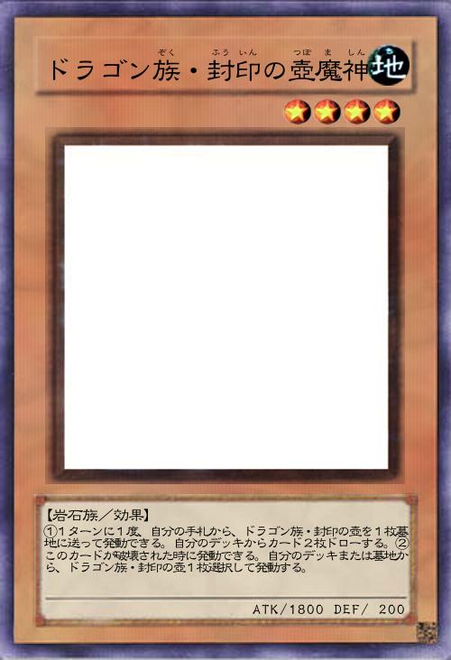 | ①1ターンに1度、自分の手札から、ドラゴン族・封印の壺を1枚墓地に送って発動できる。自分のデッキからカード2枚ドローする。②このカードが破壊された時に発動できる。自分のデッキまたは墓地から、ドラゴン族・封印の壺1枚選択して発動する。 | |||