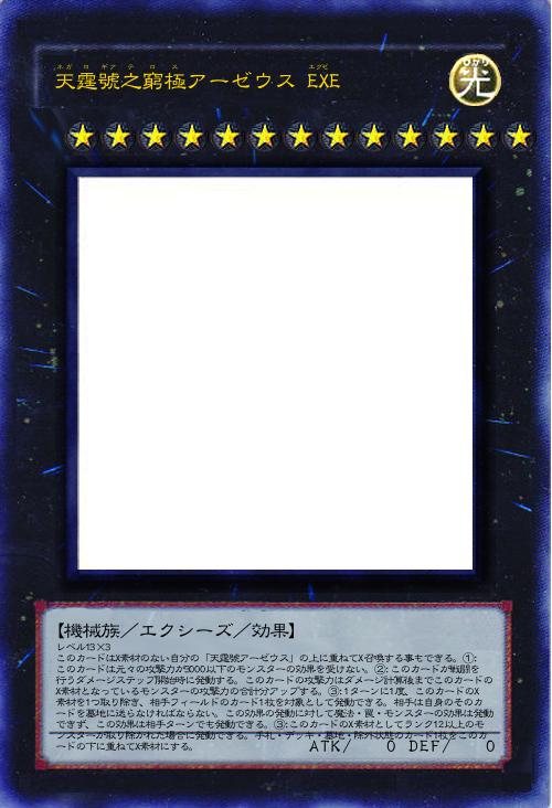 | レベル13×3 このカードはX素材のない自分の「天霆號アーゼウス」の上に重ねてX召喚する事もできる。①:このカードは元々の攻撃力が3000以下のモンスターの効果を受けない。②:このカードが戦闘を行うダメージステップ開始時に発動する。このカードの攻撃力はダメージ計算後までこのカードのX素材となっているモンスターの攻撃力の合計分アップする。③:1ターンに1度、このカードのX素材を1つ取り除き、相手フィールドのカード1枚を対象として発動できる。相手は自身のそのカードを墓地に送らなければならない。この効果の発動に対して魔法・罠・モンスターの効果は発動できず、この効果は相手ターンでも発動できる。③:このカードのX素材としてランク12以上のモンスターが取り除かれた場合に発動できる。手札・デッキ・墓地・除外状態のカード1枚をこのカードの下に重ねてX素材にする。 | |||