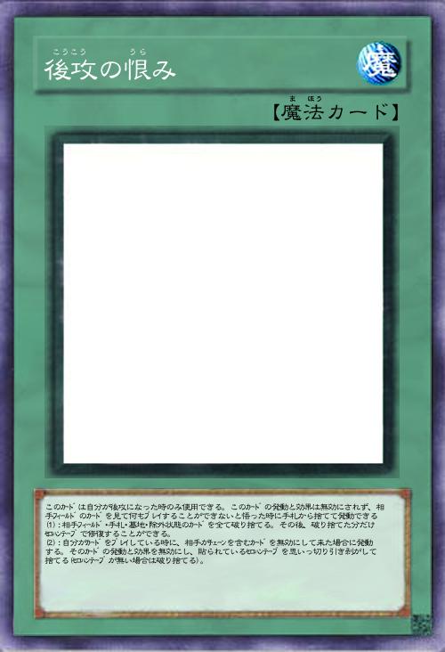 | このカードは自分が後攻になった時のみ使用できる。このカードの発動と効果は無効にされず、相手フィールドのカードを見て何もプレイすることができないと悟った時に手札から捨てて発動できる (1):相手フィールド・手札・墓地・除外状態のカードを全て破り捨てる。その後、破り捨てた分だけセロハンテープで修復することができる。 (2):自分がカードをプレイしている時に、相手がチェーンを含むカードを無効にして来た場合に発動する。そのカードの発動と効果を無効にし、貼られているセロハンテープを思いっ切り引き剥がして捨てる(セロハンテープが無い場合は破り捨てる)。 | |||