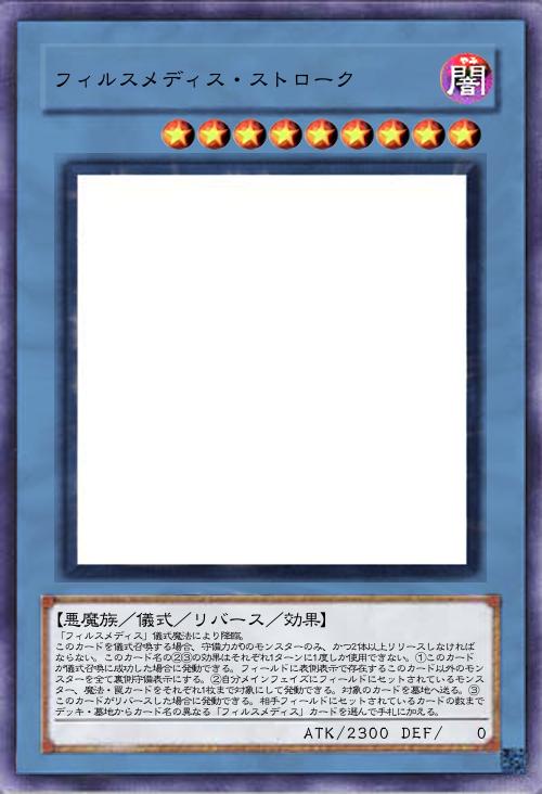 | 「フィルスメディス」儀式魔法により降臨。 このカードを儀式召喚する場合、守備力が0のモンスターのみ、かつ2体以上リリースしなければならない。このカード名の②③の効果はそれぞれ1ターンに1度しか使用できない。①このカードが儀式召喚に成功した場合に発動できる。フィールドに表側表示で存在するこのカード以外のモンスターを全て裏側守備表示にする。②自分メインフェイズにフィールドにセットされているモンスター、魔法・罠カードをそれぞれ1枚まで対象にして発動できる。対象のカードを墓地へ送る。③このカードがリバースした場合に発動できる。相手フィールドにセットされているカードの数までデッキ・墓地からカード名の異なる「フィルスメディス」カードを選んで手札に加える。 | |||