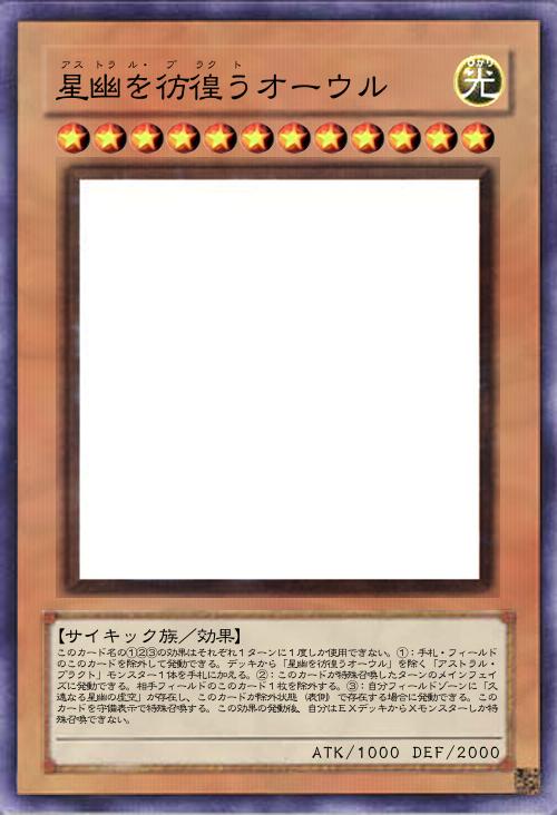 | このカード名の①②③の効果はそれぞれ1ターンに1度しか使用できない。①:手札・フィールドのこのカードを除外して発動できる。デッキから「星幽を彷徨うオーウル」を除く「アストラル・プラクト」モンスター1体を手札に加える。②:このカードが特殊召喚したターンのメインフェイズに発動できる。相手フィールドのこのカード1枚を除外する。③:自分フィールドゾーンに「久遠なる星幽の虚空」が存在し、このカードが除外状態(表側)で存在する場合に発動できる。このカードを守備表示で特殊召喚する。この効果の発動後、自分はEXデッキからXモンスターしか特殊召喚できない。 | |||