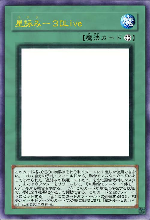 | このカード名の①②の効果はそれぞれ1ターンに1度しか使用できない。 ①:自分の手札・フィールドから、融合モンスターカードによって決められた「星詠みの歌姫-スイセイ」を含む融合素材モンスター、またはカウンターをリリースして、その融合モンスター1体をEXデッキから融合召喚する。 ②:このカードが墓地に存在する状態で、手札を1枚墓地へ送って発動できる。このカードを自分フィールドにセットする。 ③:このカードがフィールドに存在する限り、相手フィールドゾーンのカードの効果は無効化され「星詠みー3DLive」と同じ効果を得る。 | |||