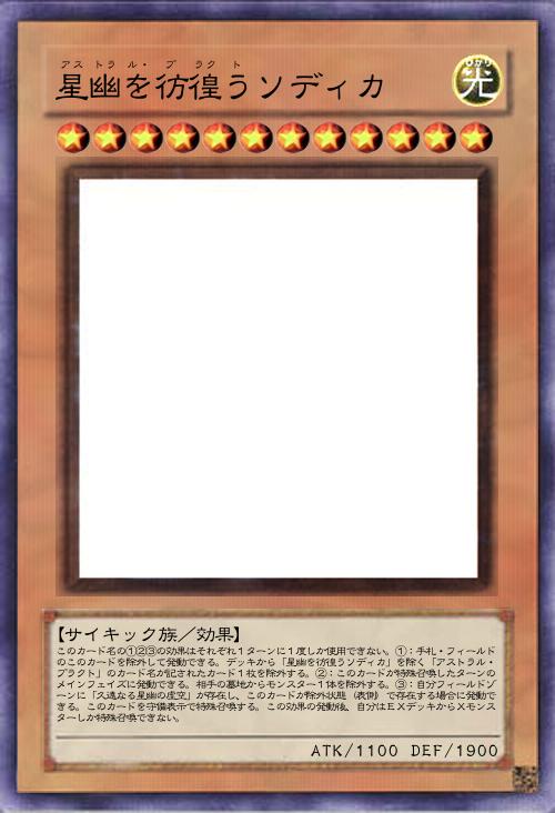 | このカード名の①②③の効果はそれぞれ1ターンに1度しか使用できない。①:手札・フィールドのこのカードを除外して発動できる。デッキから「星幽を彷徨うソディカ」を除く「アストラル・プラクト」のカード名が記されたカード1枚を除外する。②:このカードが特殊召喚したターンのメインフェイズに発動できる。相手の墓地からモンスター1体を除外する。③:自分フィールドゾーンに「久遠なる星幽の虚空」が存在し、このカードが除外状態(表側)で存在する場合に発動できる。このカードを守備表示で特殊召喚する。この効果の発動後、自分はEXデッキからXモンスターしか特殊召喚できない。 | |||