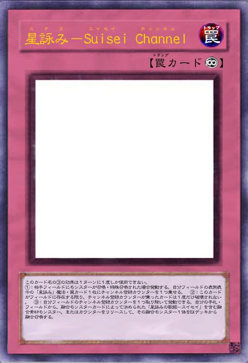 | このカード名の③の効果は1ターンに1度しか使用できない。 ①:相手フィールドにモンスターが召喚・特殊召喚された場合発動する。自分フィールドの表側表示の「星詠み」魔法・罠カード1枚にチャンネル登録カウンターを1つ乗せる。 ②:このカードがフィールドに存在する限り、チャンネル登録カウンターが乗ったカードは1度だけ破壊されない。 ③:自分フィールドのチャンネル登録カウンターを1つ取り除いて発動できる。自分の手札・フィールドから、融合モンスターカードによって決められた「星詠みの歌姫-スイセイ」を含む融合素材モンスター、またはカウンターをリリースして、その融合モンスター1体をEXデッキから融合召喚する。 | |||