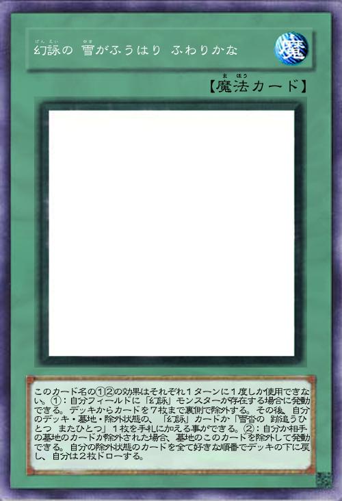 | このカード名の①②の効果はそれぞれ1ターンに1度しか使用できない。①:自分フィールドに「幻詠」モンスターが存在する場合に発動できる。デッキからカードを7枚まで裏側で除外する。その後、自分のデッキ・墓地・除外状態の、「幻詠」カードか「雪沓の 跡追うひとつ またひとつ」1枚を手札に加える事ができる。②:自分か相手の墓地のカードが除外された場合、墓地のこのカードを除外して発動できる。自分の除外状態のカードを全て好きな順番でデッキの下に戻し、自分は2枚ドローする。 | |||