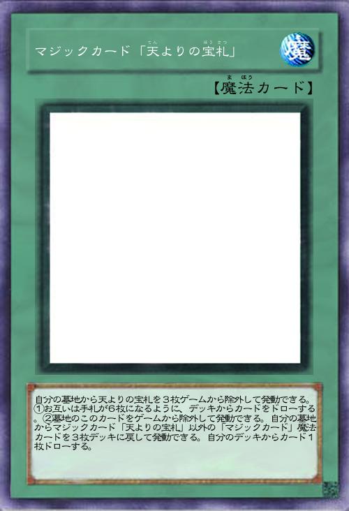 | 自分の墓地から天よりの宝札を3枚ゲームから除外して発動できる。①お互いは手札が6枚になるように、デッキからカードをドローする。②墓地のこのカードをゲームから除外して発動できる。自分の墓地からマジックカード「天よりの宝札」以外の「マジックカード」魔法カードを3枚デッキに戻して発動できる。自分のデッキからカード1枚ドローする。 | |||