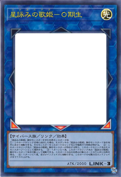 | 「星詠みの歌姫」融合モンスターを含む効果モンスター3体 ①:このカードがリンク召喚に成功した場合、EXデッキの「星詠みの歌姫」融合モンスター1体を相手に見せて発動できる。そのモンスターをこのカードのリンク先に守備表示で特殊召喚する。 ②:このカードのリンク先に「星詠みの歌姫」融合モンスターが存在する限り、このカードのリンク先はEXモンスターゾーンとして適用する。 ③:1ターンに1度、このカードのリンク先の「星詠みの歌姫」融合モンスター1体を対象として発動できる。このカードの④の効果は対象のカードの①と同じ効果を得る。 ④:1ターンに1度、自分メインフェイズに発動できる。このカードの攻撃力はエンドフェイズまで100上がる。 | |||