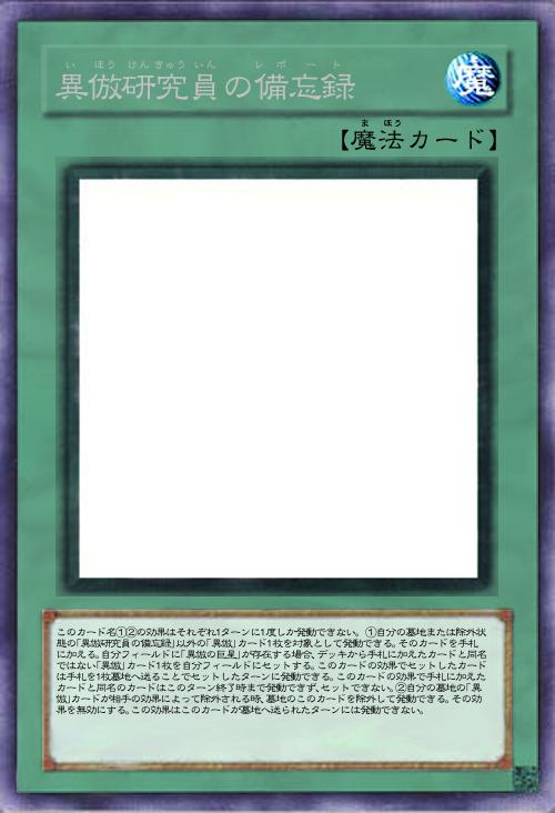 | このカード名①②の効果はそれぞれ1ターンに1度しか発動できない。①自分の墓地または除外状態の「異倣研究員の備忘録」以外の「異倣」カード1枚を対象として発動できる。そのカードを手札に加える。自分フィールドに「異倣の巨星」が存在する場合、デッキから手札に加えたカードと同名ではない「異倣」カード1枚を自分フィールドにセットする。このカードの効果でセットしたカードは手札を1枚墓地へ送ることでセットしたターンに発動できる。このカードの効果で手札に加えたカードと同名のカードはこのターン終了時まで発動できず、セットできない。②自分の墓地の「異倣」カードが相手の効果によって除外される時、墓地のこのカードを除外して発動できる。その効果を無効にする。この効果はこのカードが墓地へ送られたターンには発動できない。 | |||