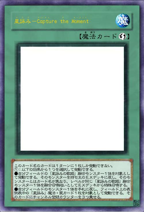 | このカード名のカードは1ターンに1枚しか発動できない。 ①:以下の効果から1つを選択して発動できる。 ●自分フィールドの「星詠みの歌姫」融合モンスター1体を対象として発動できる。そのモンスターを持ち主のEXデッキに戻し、そのモンスターとはカード名が異なり、レベルが同じ「星詠みの歌姫」融合モンスター1体を融合召喚扱いとしてEXデッキから特殊召喚する。 ●自分フィールドのモンスター1体を手札に戻し、フィールド上の表側表示の「星詠み」魔法・罠カード1枚を対象として発動できる。そのカードにチャンネル登録カウンターを3つ乗せる。 | |||