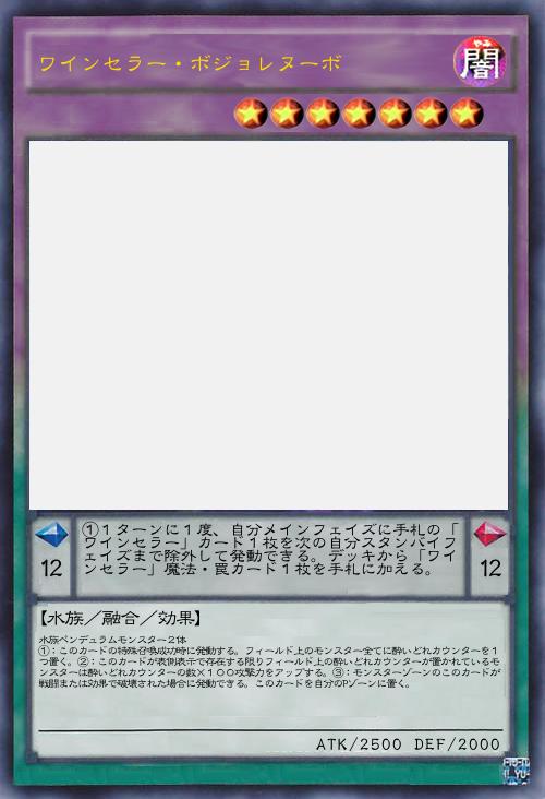 | 水族ペンデュラムモンスター2体 ①:このカードの特殊召喚成功時に発動する。フィールド上のモンスター全てに酔いどれカウンターを1つ置く。②:このカードが表側表示で存在する限りフィールド上の酔いどれカウンターが置かれているモンスターは酔いどれカウンターの数×100攻撃力をアップする。③:モンスターゾーンのこのカードが戦闘または効果で破壊された場合に発動できる。このカードを自分のPゾーンに置く。 | |||