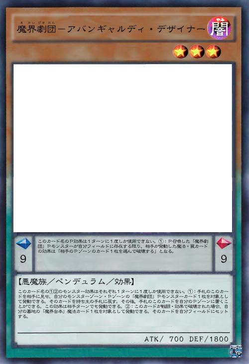 | このカード名のP効果は1ターンに1度しか使用できない。①:P召喚した「魔界劇団」Pモンスターが自分フィールドに存在する限り、相手が発動した魔法・罠カードの効果は「相手のPゾーンのカード1枚を選んで破壊する」となる。 | |||