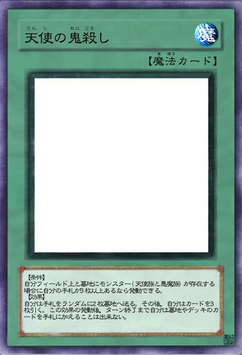 | 【条件】 自分フィールド上と墓地にモンスター(天使族と悪魔族)が存在する場合に自分の手札が3枚以上あるなら発動できる。 【効果】 自分は手札をランダムに2枚墓地へ送る。その後、自分はカードを3枚引く。この効果の発動後、ターン終了まで自分は墓地やデッキのカードを手札に加えることは出来ない。 | |||