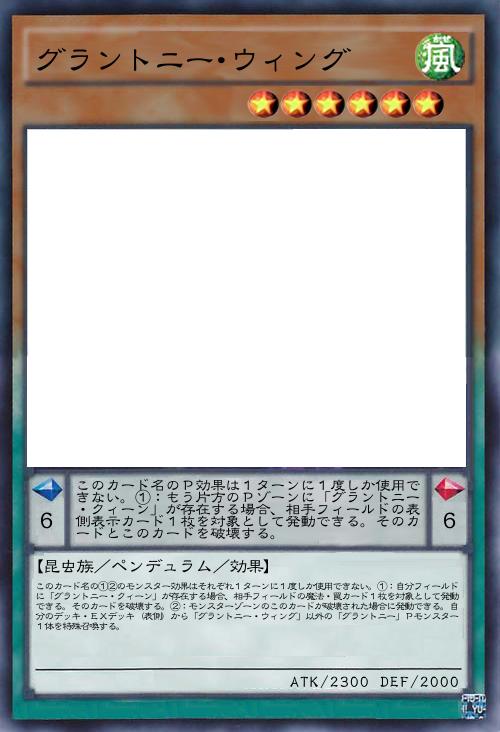| このカード名の①②のモンスター効果はそれぞれ1ターンに1度しか使用できない。①:自分フィールドに「グラントニー・クィーン」が存在する場合、相手フィールドの魔法・罠カード1枚を対象として発動できる。そのカードを破壊する。②:モンスターゾーンのこのカードが破壊された場合に発動できる。自分のデッキ・EXデッキ(表側)から「グラントニー・ウィング」以外の「グラントニー」Pモンスター1体を特殊召喚する。 | |||
