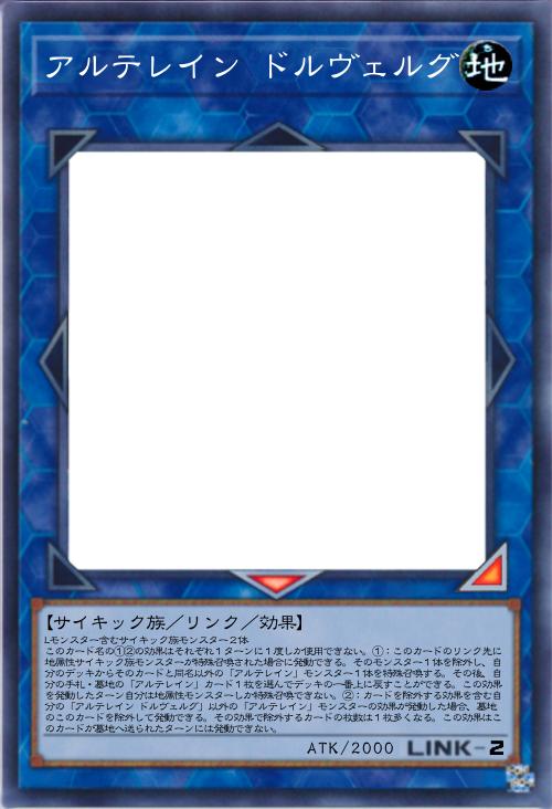 | Lモンスター含むサイキック族モンスター2体 このカード名の①②の効果はそれぞれ1ターンに1度しか使用できない。①:このカードのリンク先に地属性サイキック族モンスターが特殊召喚された場合に発動できる。そのモンスター1体を除外し、自分のデッキからそのカードと同名以外の「アルテレイン」モンスター1体を特殊召喚する。その後、自分の手札・墓地の「アルテレイン」カード1枚を選んでデッキの一番上に戻すことができる。この効果を発動したターン自分は地属性モンスターしか特殊召喚できない。②:カードを除外する効果を含む自分の「アルテレイン ドルヴェルグ」以外の「アルテレイン」モンスターの効果が発動した場合、墓地のこのカードを除外して発動できる。その効果で除外するカードの枚数は1枚多くなる。この効果はこのカードが墓地へ送られたターンには発動できない。 | |||