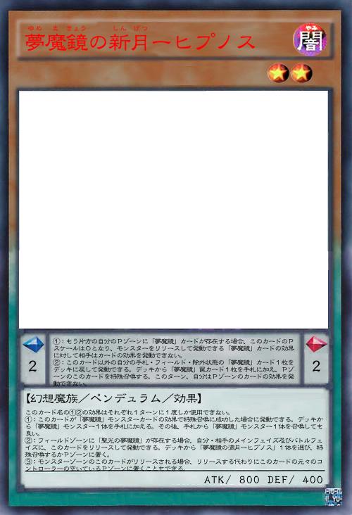 こちらは効果でスケール0になれます。レベル1の「イケロス」ちゃんも出せるし、「満月ヒプノス」の効果でP召喚した時に「夢魔鏡」効果で出た扱いにもなるのでツヨツヨちゃんです。