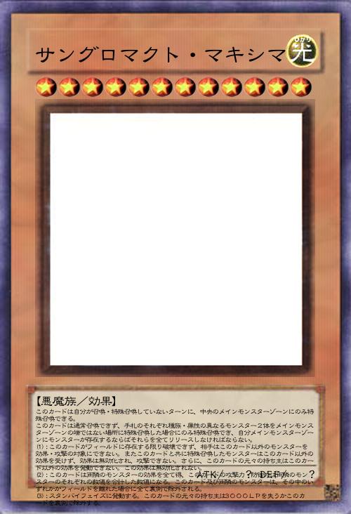 | このカードは自分が召喚・特殊召喚していないターンに、中央のメインモンスターゾーンにのみ特殊召喚できる。 このカードは通常召喚できず、手札のそれぞれ種族・属性の異なるモンスター2体をメインモンスターゾーンの端ではない場所に特殊召喚した場合にのみ特殊召喚でき、自分メインモンスターゾーンにモンスターが存在するならばそれらを全てリリースしなければならない。 (1):このカードがフィールドに存在する限り破壊できず、相手はこのカード以外のモンスターを効果・攻撃の対象にできない。またこのカードと共に特殊召喚したモンスターはこのカード以外の効果を受けず、効果は無効化され、攻撃できない。さらに、このカードの元々の持ち主はこのカード以外の効果を発動できない。この効果は無効化されない。 (2):このカードは両隣のモンスターの効果を全て得、このカードの攻撃力・防御力は両隣のモンスターのそれぞれの数値を合計した数値になる。このカード及び両隣のモンスターは、その中のいずれかがフィールドを離れた場合に全て裏側で除外される。 (3):スタンバイフェイズに発動する。このカードの元々の持ち主は3000LPを失うかこのカードを裏側で除外する。 | |||