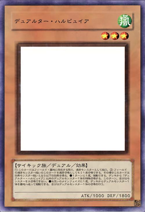 | ①:このカードはフィールド・墓地に存在する限り、通常モンスターとして扱う。②:フィールドの通常モンスター扱いのこのカードを通常召喚としてもう1度召喚できる。その場合このカードは効果モンスター扱いとなり以下の効果を得る。●1ターンに1度、発動できる。デッキから「デュアルター・ハルピュイア」以外のデュアルモンスター1体を特殊召喚する。このターン、自分はモンスターをX召喚できない。●お互いのメインフェイズに1度、デッキからデュアルモンスター1体を墓地へ送って発動できる。自分はデュアルモンスター1体の召喚を行う。 | |||