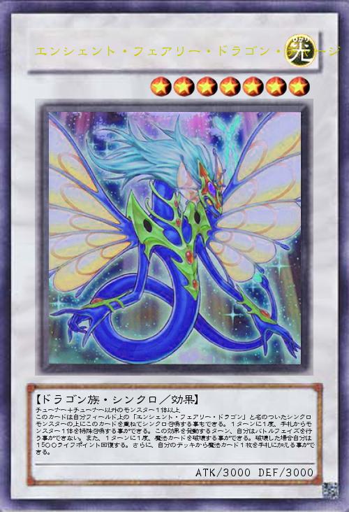 チューナー+チューナー以外のモンスター1体以上 このカードは自分フィールド上の「エンシェント・フェアリー・ドラゴン」と名のついたシンクロモンスターの上にこのカードを重ねてシンクロ召喚する事もできる。1ターンに1度、手札からモンスター1体を特殊召喚する事ができる。この効果を発動するターン、自分はバトルフェイズを行う事ができない。また、1ターンに1度、魔法カードを破壊する事ができる。破壊した場合自分は1500ライフポイント回復する。さらに、自分のデッキから魔法カード1枚を手札に加える事ができる。 |